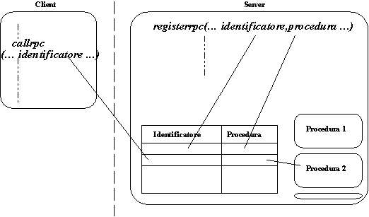 SERVER - registerrpc(): associa un identificatore unico alla procedura remota implementata nell'applicazione (una entry nella tabella dinamica per ogni procedura).