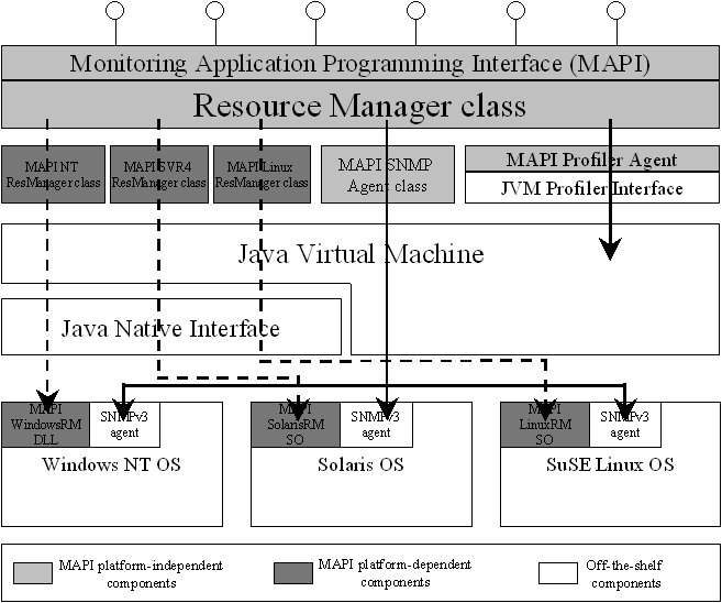 MAPI exploits the Java Virtual Machine Profiler Interface (JVMPI) to collect several application-level events produced by Java applications (e.g., object allocation and method invocation). In addition, it employs the Java Native Interface (JNI) technology to make possible the integration with platform-dependent native monitoring mechanisms, which we have currently implemented for Windows NT, Solaris and Linux. MAPI encapsulates also legacy SNMP components and filters their information to yield aggregated monitoring indicators, thus limiting the overhead due to long sequences of SNMP requests/responses.