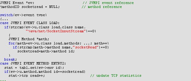 Figure 3 sketches a piece of the MAPI Profiler Agent code. When a registered event occurs, JVMPI signals an event ev to the profiler that performs event-specific actions. In particular, the figure shows the initializations done when the class SocketInputStream is loaded. After initializing the internal socketread variable, the profiler can trace any invocation of the method socketRead() by incrementing the stat->tcp_read counter, which maintains the account for the TCP read operations of any SOMA agent in a specified time interval. These data represent a rough estimation of the incoming network traffic produced by Java service components. If more precise information about the traffic due to specific Java threads is needed, ResourceManager can command the MAPI Profiler Agent to examine dynamically the invocation parameters of the socketRead()/socketWrite() methods. This is possible by setting at the maximum level of detail (JVMPI_DUMP_LEVEL_2) the triggering of JVMPI_EVENT_OBJECT_DUMP for the specified objects. The default of the MAPI Profiler Agent, of course, is different to avoid the excessive overhead of the dynamic generation and processing of object dumps.