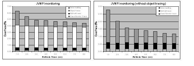 We have also measured the overhead introduced by the MAPI Profiler Agent. In this case, the JVM notifies continuously certain kinds of events (not only at polling times), and the refresh time represents the interval to process the collection of observed events in order to obtain the desired concise monitoring indicators. Figure 6 depicts the different contributions of the Overhead% related to data access and to the JVMPI notification mechanisms, i.e., monitor, method and object tracing. The results obtained for the Solaris platform are very similar to the ones for Windows NT and Linux, with differences lower than 3% of the maximum Overhead%. The figure shows that the JVMPI notification is scarcely intrusive under different load conditions and independent of refresh times. The refresh time affects only the overhead due to the processing of collected events and to the reading of MAPI indicators. Object tracing has shown to be the most relevant factor in the MAPI Profiler Agent intrusion because of the large amount of data it requires to receive and collect in the profiler. In any case, the total overhead can be kept under 2.0% when the refresh interval is greater than 2 seconds and object tracing is disabled.