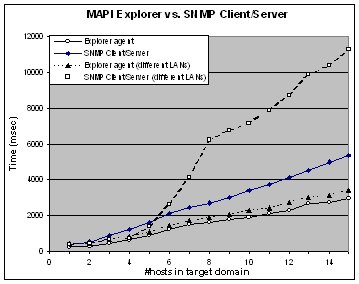 Finally, we have considered the distributed monitoring and control of SOMA agents, which exploits mobile Explorer agents to migrate and to interrogate locally the MAPI modules. The size of Explorers vary from about 8kB (at the first migration, without carrying any monitoring indicator) to 15kB (at the end of exploration, including all the monitoring state of the target domain). Figure 7 reports the time an Explorer needs to collect monitoring indicators by using MAPI SNMP Agents, depending on the number of hosts in the target domain. The MAPI SNMP Agent filters and pre-processes the monitoring data to collect. For several policies about MA resource consumption, we have experienced that the MAPI SNMP Agent operations significantly reduce the size of MAPI indicators collected by the Explorer with respect to the size of corresponding raw MIB values (1:3 reduction). This optimization is impossible in a traditional Client/Server approach where a fixed and centralized manager remotely interrogates the different SNMP agents involved (SNMP C/S graph in the figure). In addition, the MA technology is particularly suitable when the target domain includes different LANs, interconnected by low bandwidth links (in our measurements, two Ethernet LANs with n/2 hosts and connected via a 56kb modem link). In this case, Explorer uses the slow link only once to migrate from one LAN to the other, while the C/S solution should use the link at least in n/2 SNMP requests and n/2 SNMP replies, wherever the centralized manager is located.