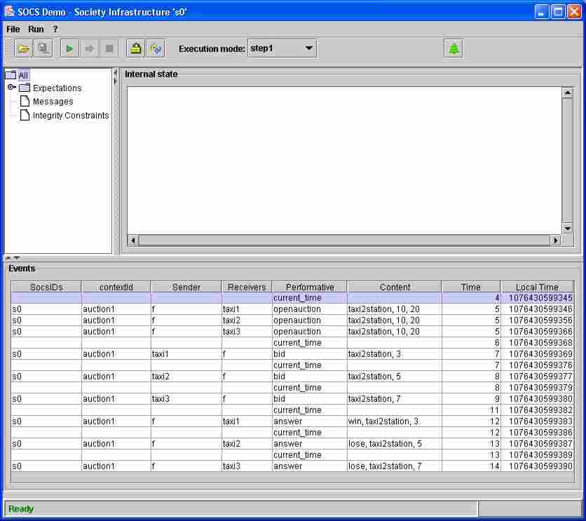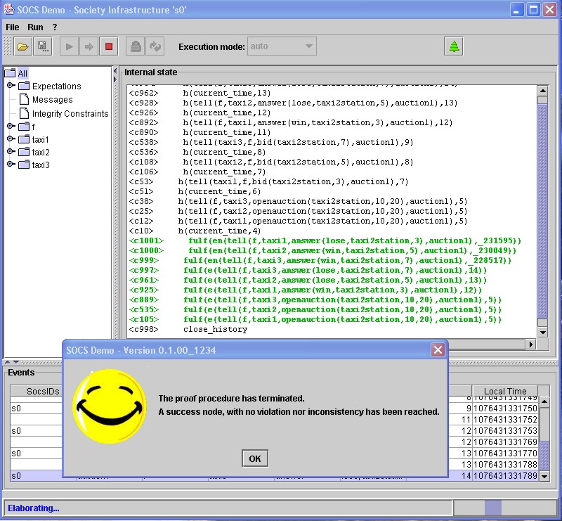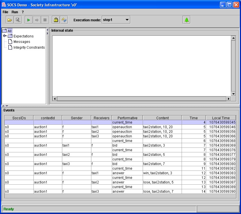 We are going to present two different scenarios: in the first scenario the protocol is satisfied, and the SOCS-SI tool communicates the successful verification of the interaction (screenshots 1-4). In the second scenario, instead, the auctioneer forgets to notify some bidders that they have lost. When the auction terminates, the SOCS-SI detects this violation of the protocol (screenshots 5-6).