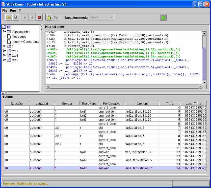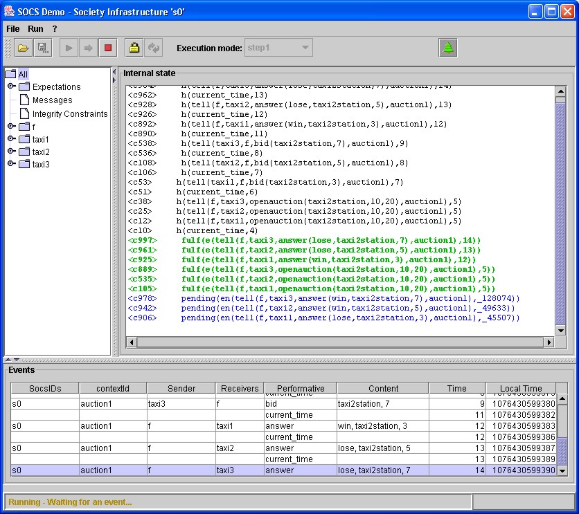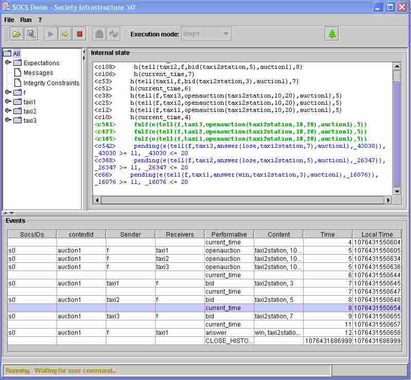 This page illustrates a storyboard of the SOCS-SI demo to be presented at AAMAS 2004. The examples are based on the "first price sealed bid" auction, whose protocol definition is presented later in this page.